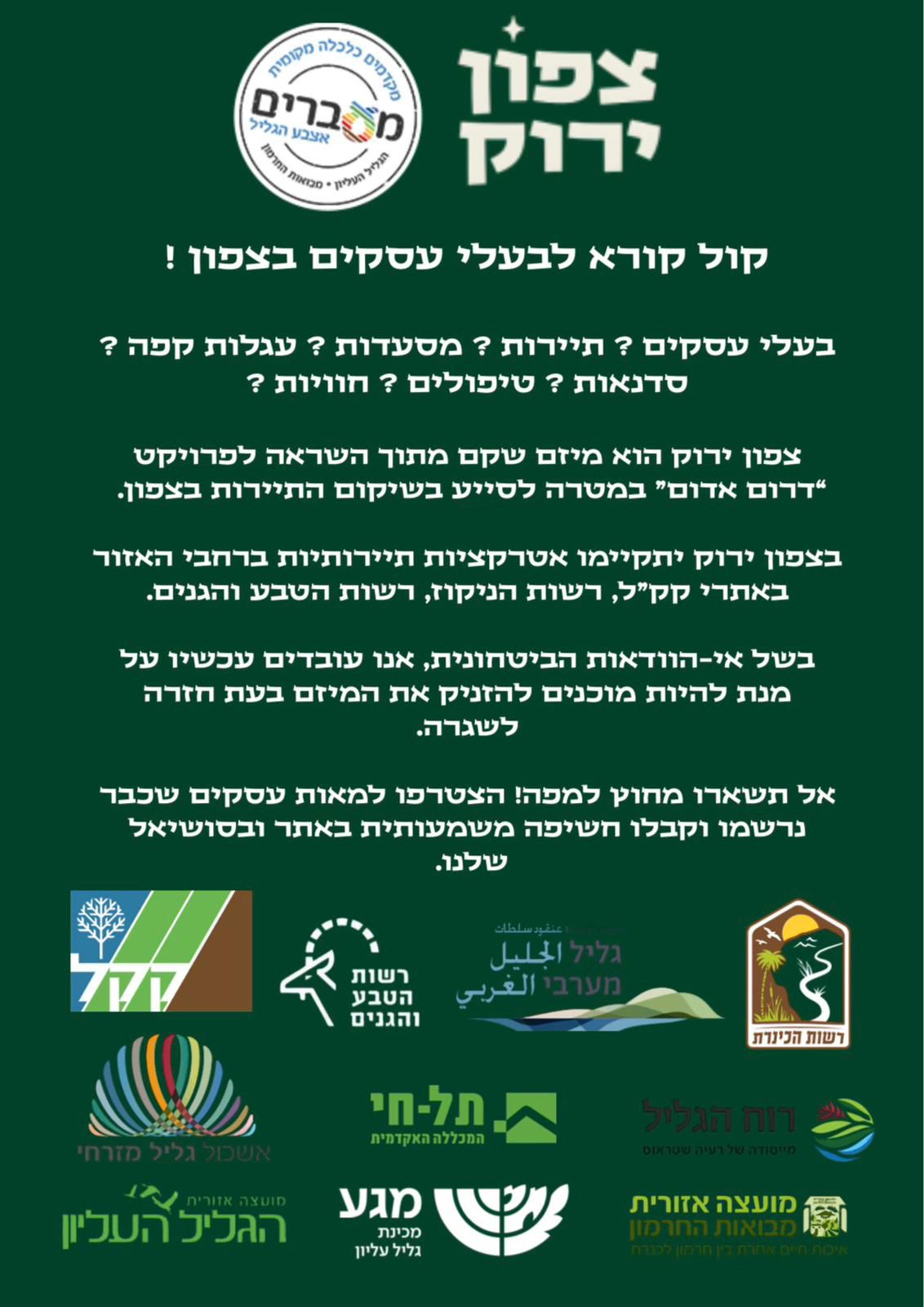 צפון ירוק הוא מיזם שקם מתוך השראה לפרויקט “דרום אדום” במטרה לסייע בשיקום התיירות בצפון.