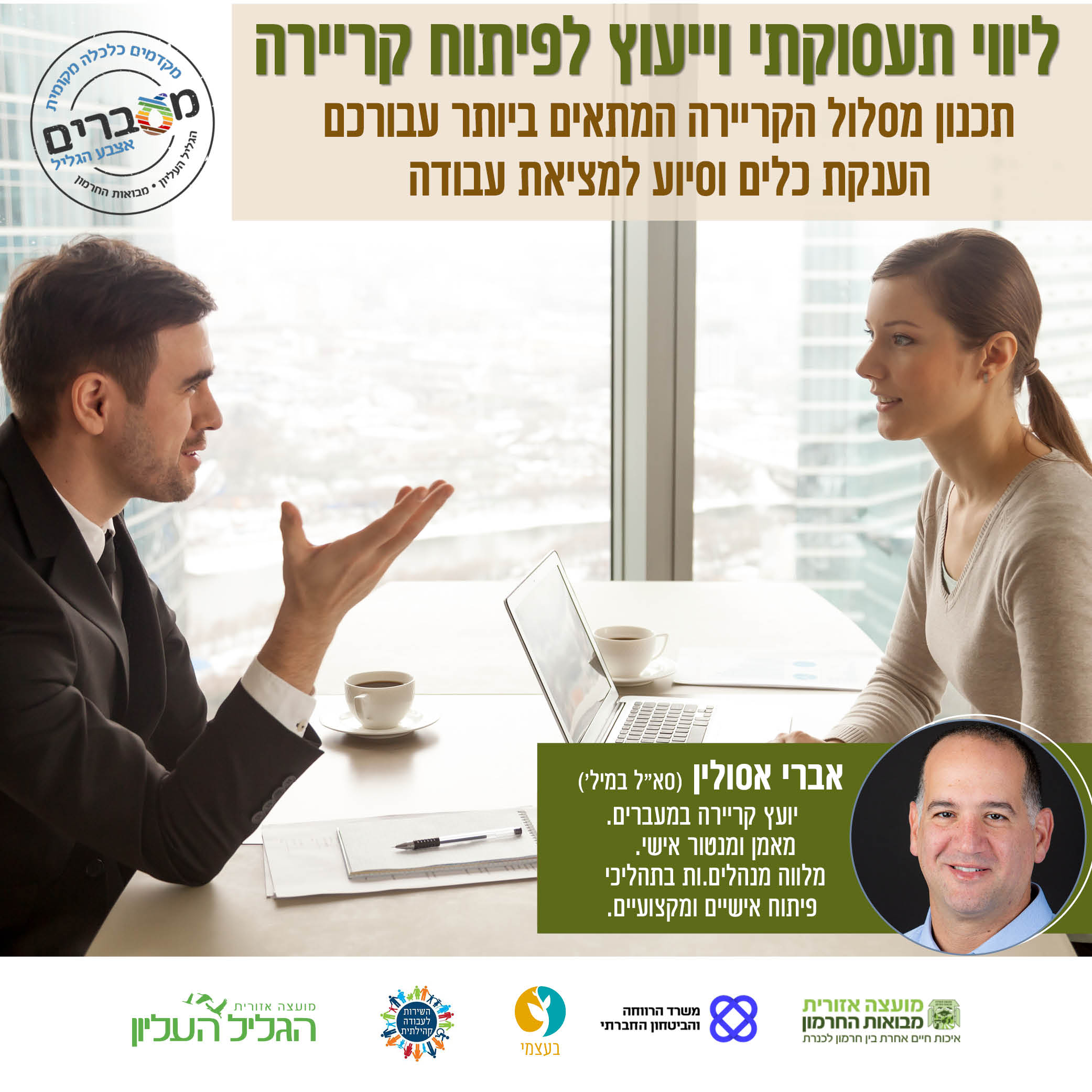 לתיאום פגישה אישית להכוונה תעסוקתית וייעוץ לפיתוח קריירה פנו לאברי אסולין  052-9243202 (בבקשה לשלוח לו הודעה ב whatsapp)